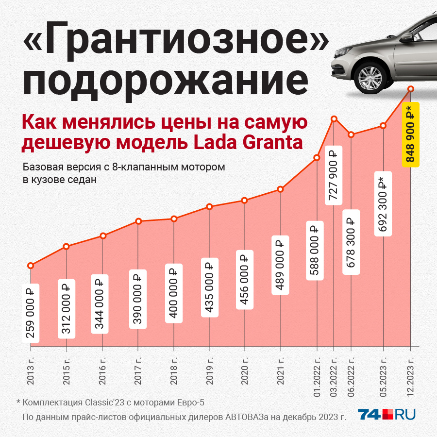 Красноречивей всего ситуация с ценами в инфографике, на которой мы уже несколько лет отмечаем стоимость наиболее доступной Lada Granta: именно она определяет нижнюю планку цен новых автомобилей. Вазовская модель со своего дебюта в 2012 года подорожала почти в четыре раза, с 229 до 849 тысяч за самую доступную версию. На графике видно, что процесс ускорился в ковидные годы, и локального пика цена «Гранты» достигла весной 2022 года. Дальнейшее снижение обманчиво: летом того года АВТОВАЗ перешел на выпуск существенно упрощенных машин без АБС, подушек безопасности и с двигателями стандарта «Евро-2». Но когда осенью 2023 года «упрощенка» закончилась, стоимость минимальной Granta с АБС, подушкой безопасности и мотором «Евро-5» достигла 848 900 рублей, то есть с начала 2022 года модель подорожала на 43%. А минимальная версия с кондиционером стоит теперь 929 900 рублей.