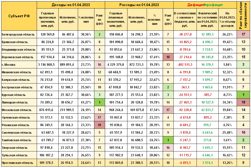 Мы решили уточнить, как были исполнены на 1 апреля бюджеты во всех регионах, входящих в состав Центрального федерального округа. Данные были собраны, обобщены и сведены в таблицу. Проведено ранжирование в части исполнения отдельно по доходам и расходам, а также по уровню сбалансированности бюджетов.