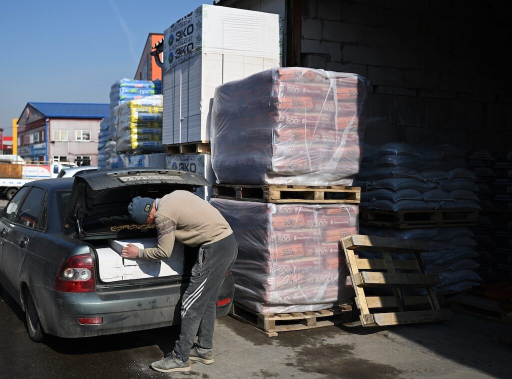 8410233 12.04.2023 Мужчина загружает стройматериалы в багажник автомобиля на строительном рынке «Владимирский тракт» в Московской области.