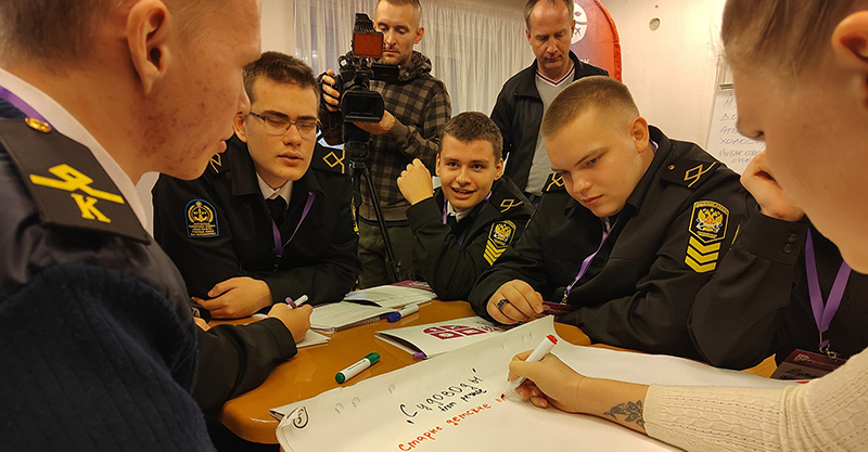 После шутливого задания молодежь разделили на команды и предложили сформулировать, что в городе вызывает негативные эмоции, а что – приятные.