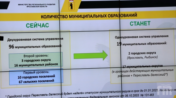 Существующие в настоящее время в Ярославской области 96 различных муниципальных образований преобразуют в 19: два городских округа – Ярославль и Рыбинск и 17 муниципальных округов. По новому законодательству существующий сейчас городской округ Переславль-Залесский получит статус муниципального округа.