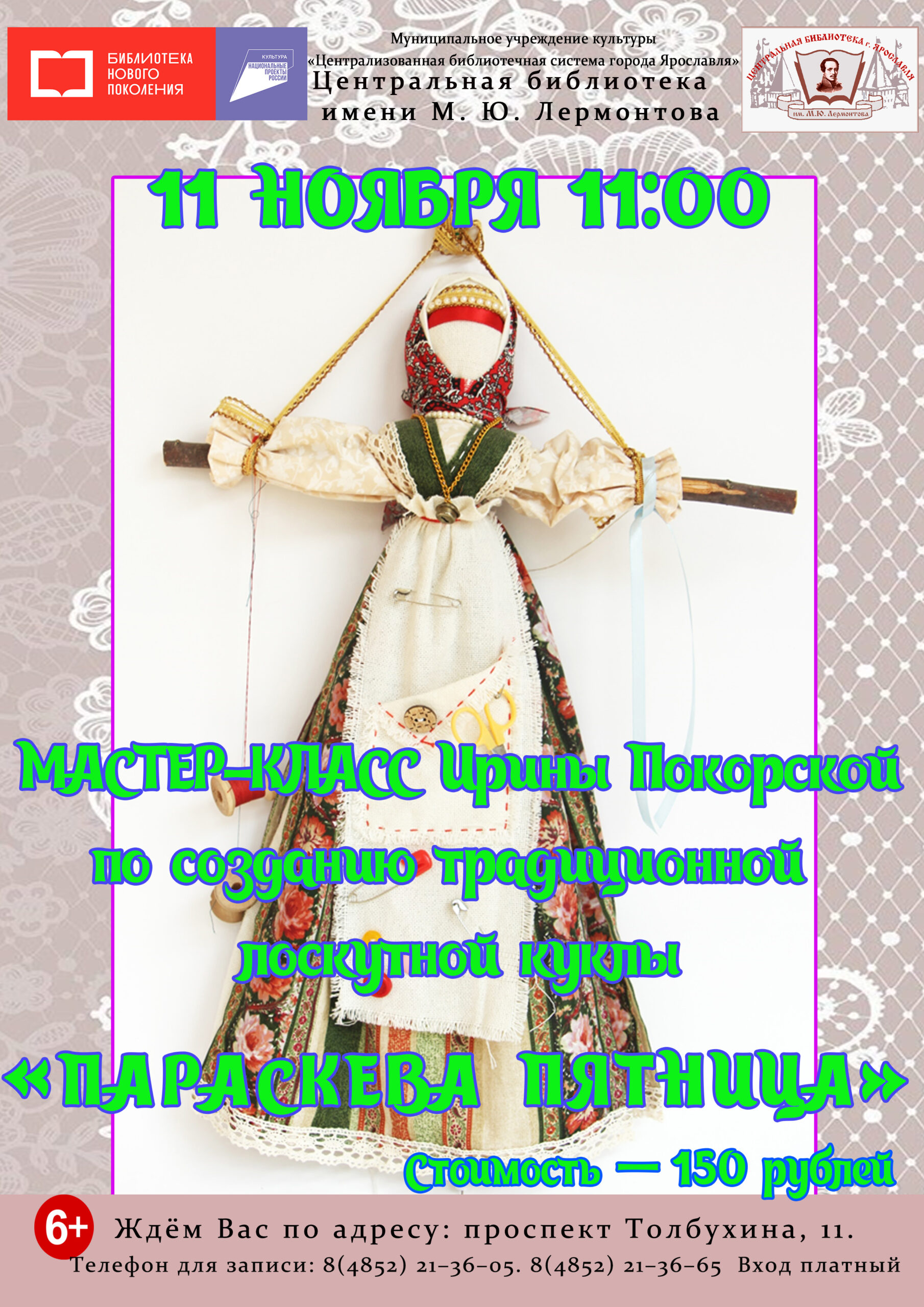 11 ноября в 11:00 в зале краеведения «Золотое кольцо России» Центральной библиотеки имени М. Ю. Лермонтова состоится очередная встреча клуба выходного дня «Ладушка», на которой мы будем создавать куклу Параскеву Пятницу.