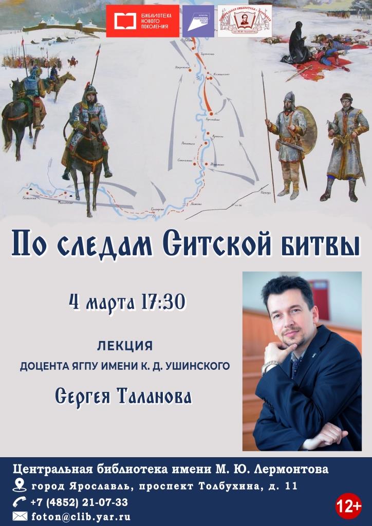 4 марта в 17:30 в Центральной библиотеке имени М. Ю. Лермонтова состоится лекция доцента исторического факультета Ярославского государственного педагогического университета имени К. Д. Ушинского Сергея Львовича Таланова «По следам Ситской битвы», посвященная героическим дням минувших дней, а именно — битве на реке Сить, изменившей ход истории страны. Это сражение стало одним из ключевых сражений монгольского похода на Северо-Восточную Русь (1237-1238).