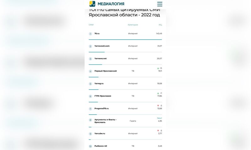 Опубликован рейтинг самых цитируемых СМИ Ярославской области за 2022 год.