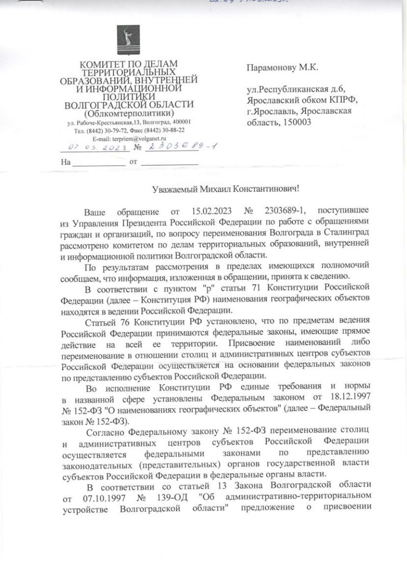 На обращение ярославских коммунистов получен ответ из комитета по делам территориальных образований, внутренней и информационной политики Волгоградской области.
