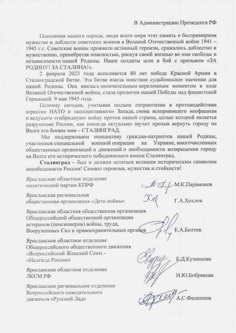«Поколения нашего народа, люди всего мира чтят память о беспримерном мужестве и доблести советских воинов в Великой Отечественной войне 1941 – 1945 гг. Советские воины проявили истинный героизм, сражались доблестно и мужественно, пренебрегая опасностью, рискуя своей жизнью во имя свободы и независимости нашей Родины. Наши солдаты шли в бой с призывом «ЗА РОДИНУ! ЗА СТАЛИНА!» — говорится в обращении. — Мы поддерживаем инициативу граждан-патриотов нашей Родины, участников специальной военной операции на Украине, многочисленных общественных организаций и движений о необходимости возвращения городу на Волге его исторического победоносного имени Сталинград.