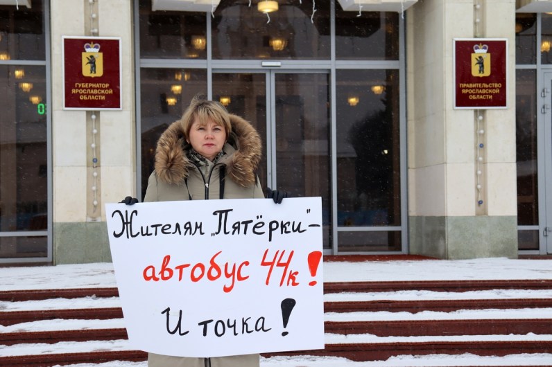 3 февраля председатель фракции КПРФ Ярославской областной Думы Елена Кузнецова вышла с одиночным пикетом к зданию регионального правительства. «Жителям «Пятерки» — автобус 44к! И точка!» — написано на плакате депутата.
