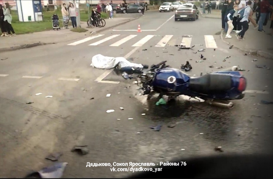 Вечером 15 сентября на перекрестке проспекта Фрунзе и улицы Колмогорова в Ярославле столкнулись черный седан и мотоцикл.
