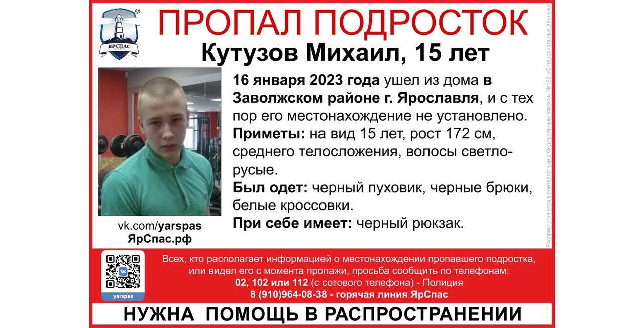 15-летний Михаил Кутузов ушел из дома в Заволжском районе и пропал. Мальчик ростом 172 сантиметра, среднего телосложения со светло-русыми волосами. Подросток был одет в черный пуховик, черные брюки и белые кроссовки. С собой у него был черный рюкзак.