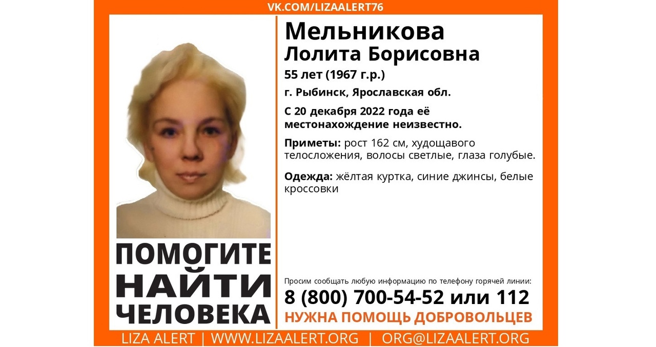 В Ярославской области идут поиски 55-летней Лолиты Мельниковой. Женщина пропала 20 декабря в Рыбинске.