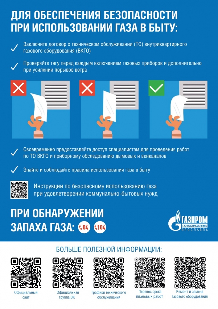Для обеспечения безопасности при использовании газа в быту: - заключите договор на техническое обслуживание внутриквартирного газового оборудования - проверяйте тягу перед каждым включением газовых приборов и дополни
