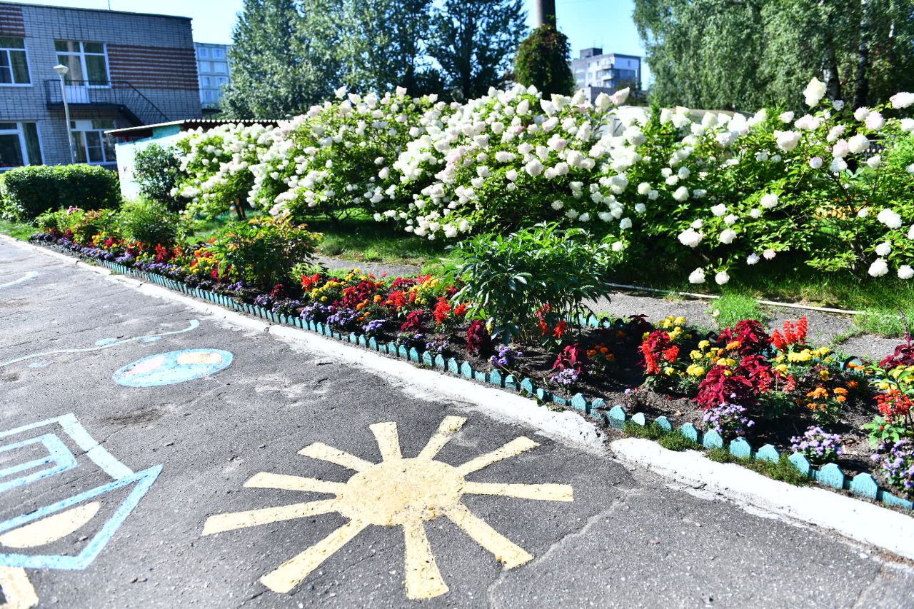 Работники детского сада №97 по адресу Красноборская, 21А украшают свою территорию сальвией, петуньями, бархатцами, колеусом, агератумом, а также лилиями, кустами пионов и гортензий.