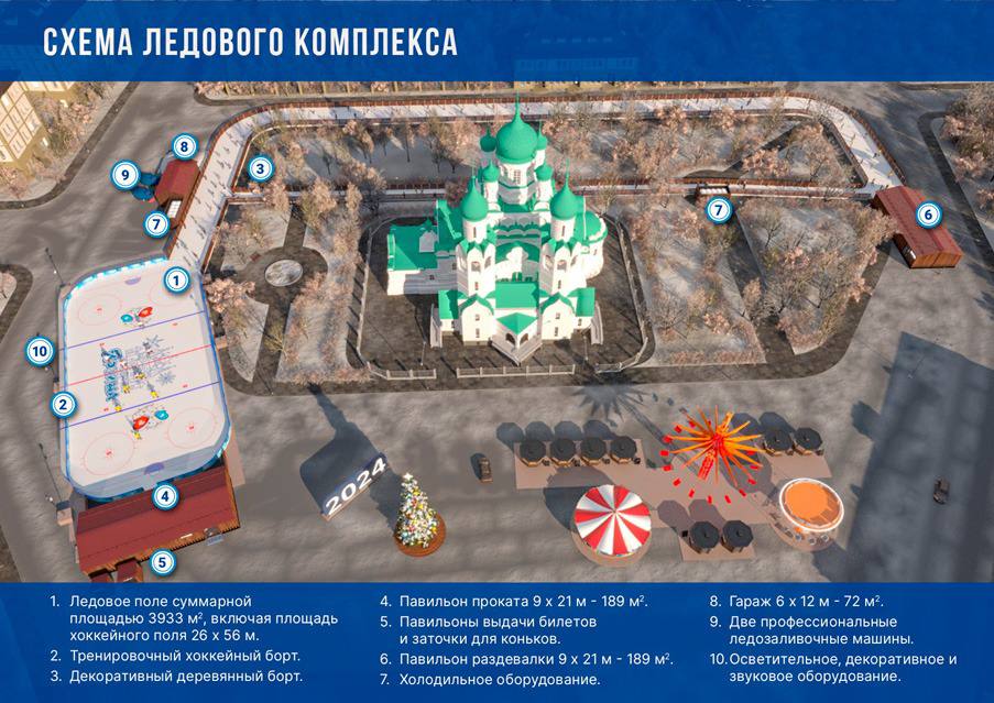 — Площадь всего ледового комплекса будет 3933 кв.м. Сам каток будет размером 26x56 метров. В этом году помимо традиционной хоккейной площадки, оборудуем дорожки около храма Ильи Пророка. Кроме массового катания, на катке будем проводить спортивные мероприятия, мастер-классы по разным видам спорта, — рассказала директор учреждения «Дирекция спортивных сооружений» Александра Хартина.