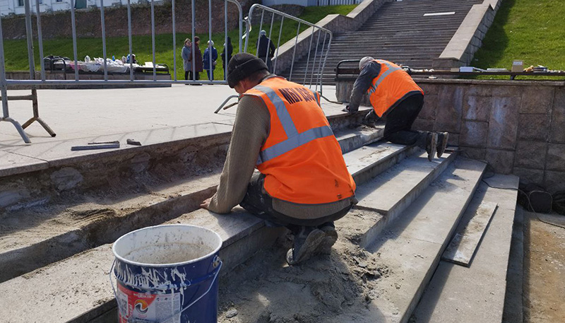 После зимы на лестнице возле причала в Рыбинске разрушились гранитные ступени. Сегодня их начали ремонтировать сотрудники МБУ «ДЭС».