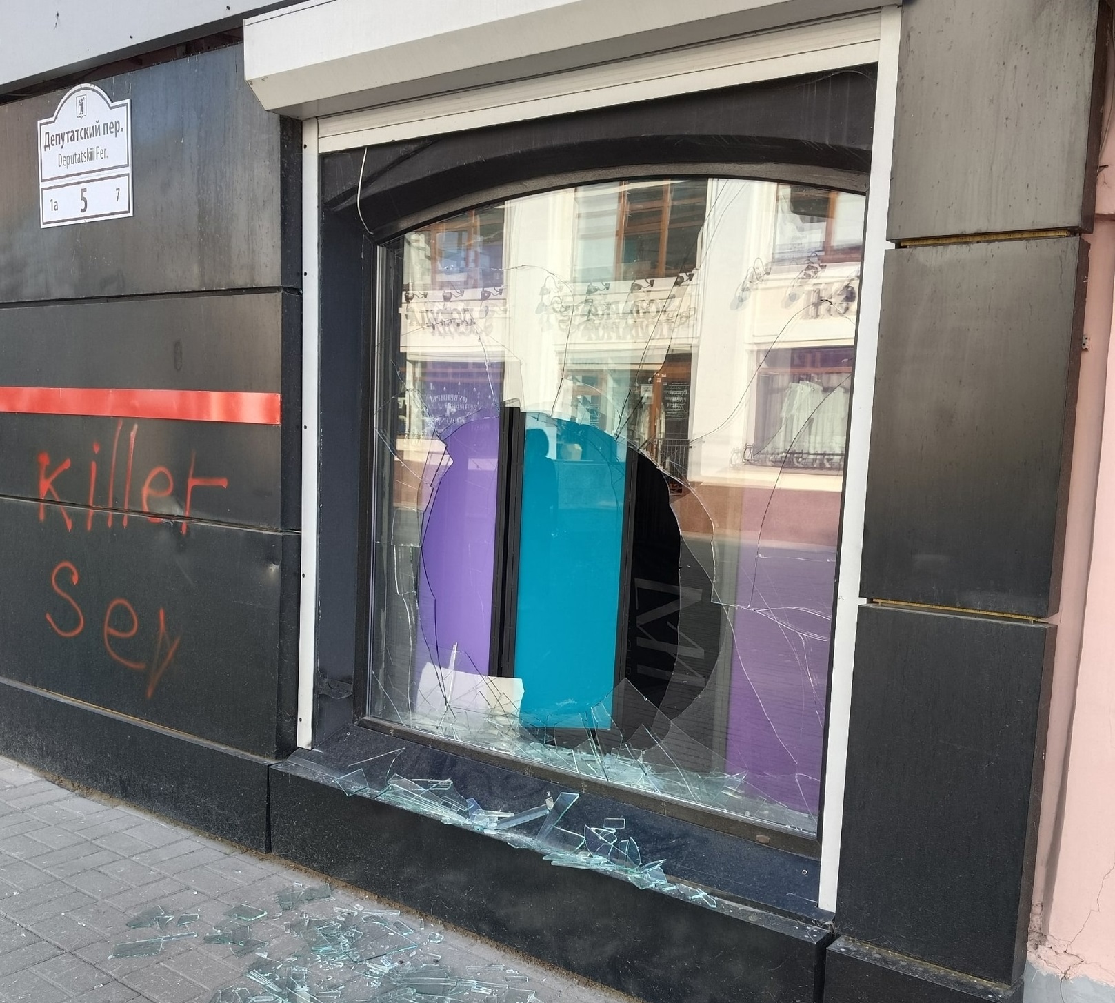 На стене около разбитого окна оставлена надпись «killer sex». По словам очевидцев, которые пишут в комментариях одного из ярославских пабликов в соцсетях, это был «просто молодой парень в шортах, в темной рубашке, темная кепка, сейчас гуляет по центру города, у него в руках баллончик, портит людям вещи, стекла разбивает».