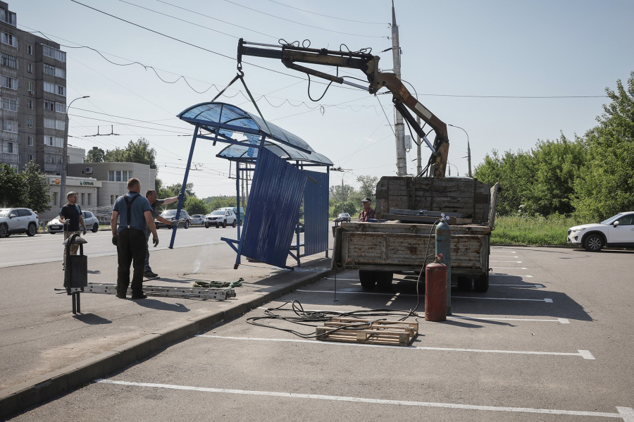 Сегодня демонтировали остановочный павильон на ул. М. Горького. Здесь в начале следующей недели будет установлен новый, работы ведутся за счет частного инвестора.
