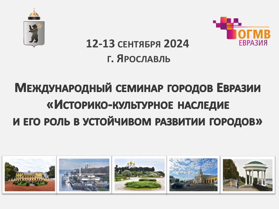 12-13 сентября 2024 года в мэрии города Ярославля состоится семинар на тему «Историко-культурное наследие и его роль в устойчивом развитии городов». Мероприятие организовано в партнерстве с Международной ассоциацией «Объединенные города и местные власти Евразии».