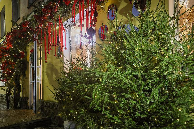 Яркие гирлянды, россыпи новогодних огней, живописные инсталляции из пушистых еловых веточек и блестящих новогодних бус.