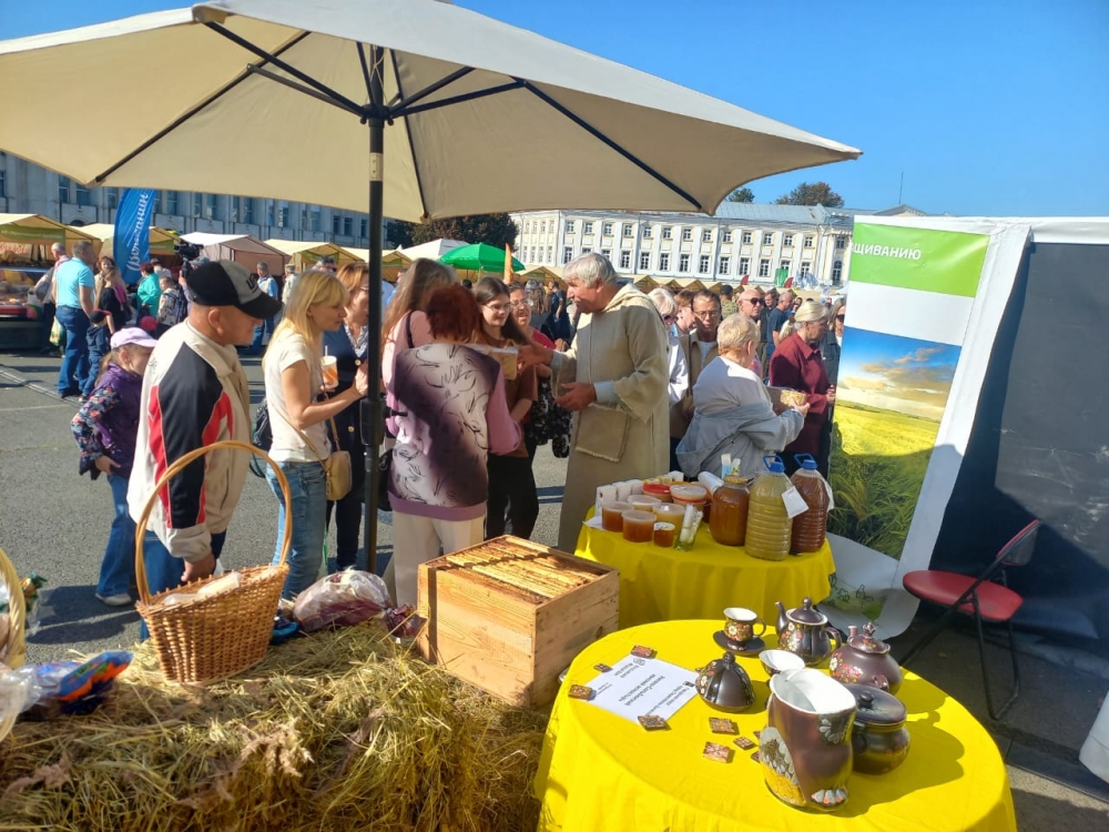 На нашей экспозиции были представлены товары переславских аграриев. Радушная хозяйка Нина Клинова встречала посетителей ярмарки, рассказывала о гостеприимном Переславском крае. В качестве угощения гостям предлагался торт «Залесский медовик», испеченный директором Дома культуры Переславля-Залесского Татьяной Трофимовой по своему рецепту.