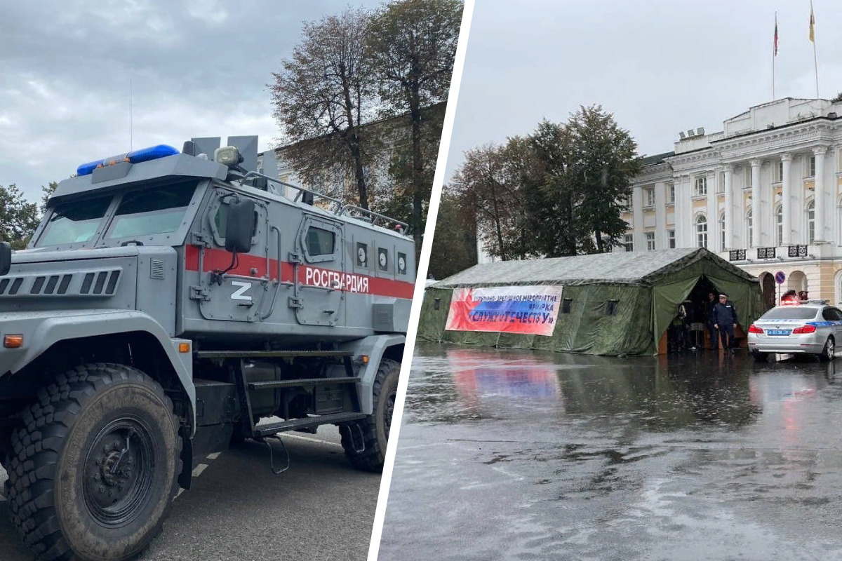 На площади выстроились боевые машины и военные в форме, также перед зданием правительства поставили палатку пункта отбора на военную службу по контракту. Вот только с погодой не повезло. Первую половину дня военная техника стояла в лужах.