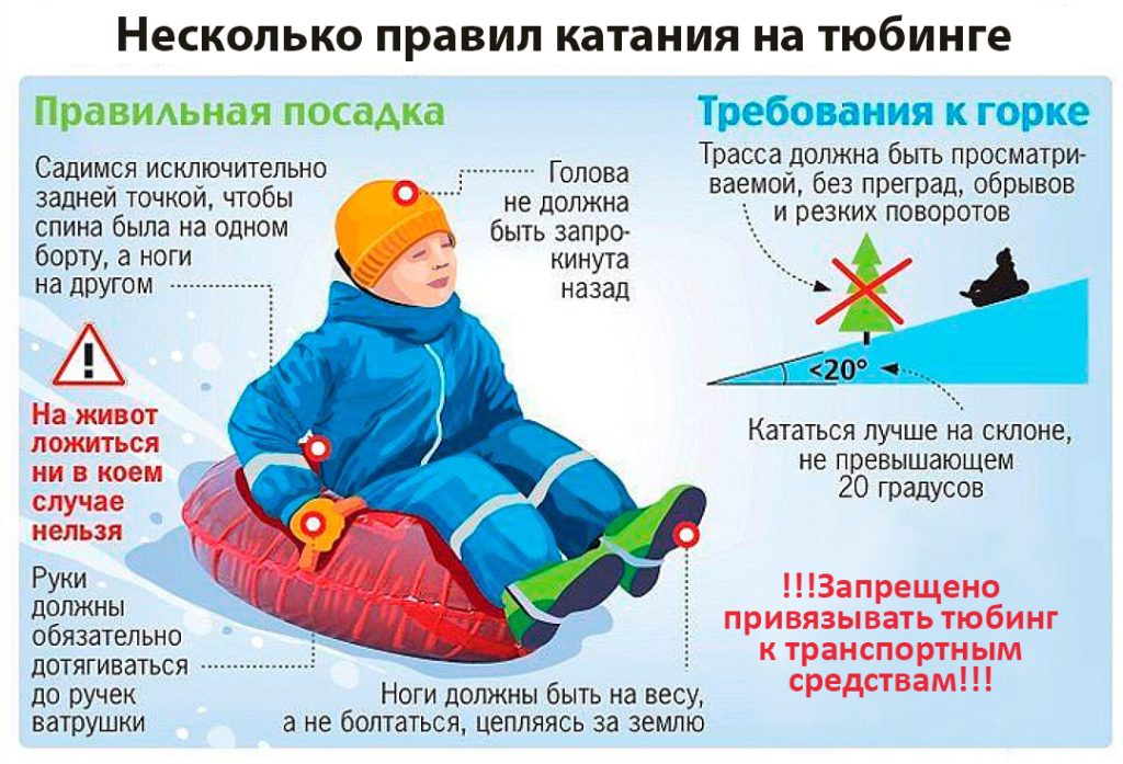 Нельзя спускаться на тюбинге с горки, если впереди имеются препятствия. Например, растут деревья, стоят дети, лежит кусок льда, камни, доска и т.д.; Нельзя скреплять «ватрушки» между собой, привязывать их к транспортным средствам; Нельзя кататься на тюбингах большим количеством людей; Нельзя начинать спускаться до того, пока катающиеся впереди люди не скатились с горки полностью; Нельзя кататься на «ватрушке» стоя или лежать на ней при спуске, прыгать или пытаться привстать. Нельзя кататься на тюбинге вдвоем с ребенком: невозможно контролировать ситуацию, когда одной рукой приходится держать ребенка, а другой тюбинг.Ортопеды встревожены резким увеличением количества травм у детей и взрослых после катания на тюбингах. Травмироваться можно и во время катания на обычных санках, ледянках, лыжах и кусках картона, если ребенок не знаком с обычными правилами безопасности катания с горки.