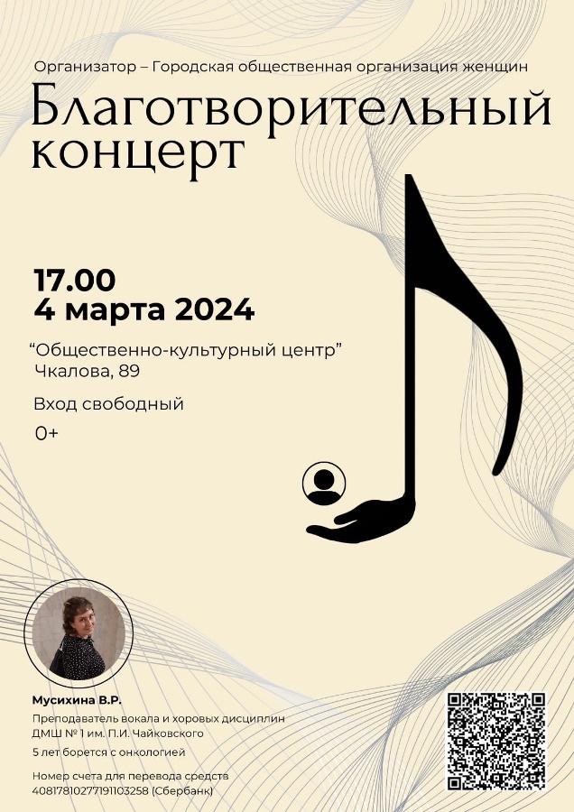 Его проведут в поддержку преподавателя музыкальной школы №1 имени Чайковского Вероники Мусиновой. Воспитанники и педагоги музыкальных школ города и детских школ искусств выступят с концертом, во время которого будет организован сбор средств на лечение педагога.