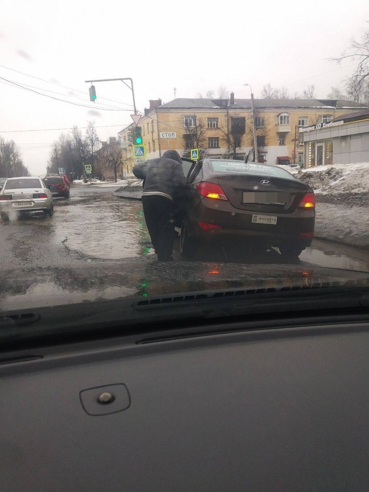 В Ленинском районе Ярославля «Хёндэ» угодила в яму, пытаясь пересечь лужу. Об этом пишут жители в социальных сетях.