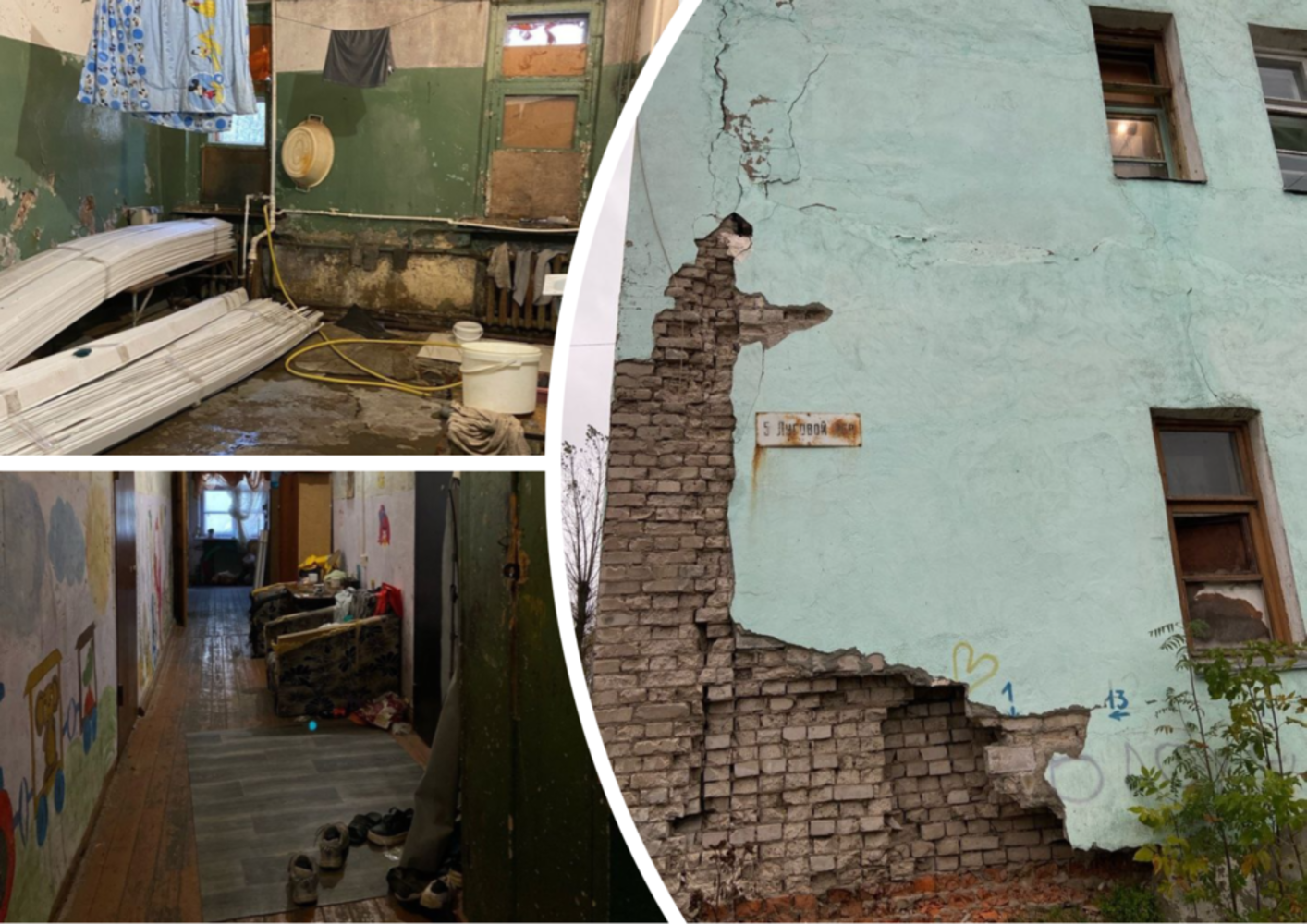 «Обратите внимание на дом, который находится в 7 минутах езды от правительства. Мы уже не знаем, куда обратиться и как нам спасаться, вместе с детьми всех возрастов, «существуя» в трущобе по адресу: 5-й Луговой переулок, дом 6, во Фрунзенском районе. Многочисленные комиссии и суды признали дом сначала аварийным, а затем непригодным для жилья по разным причинам, но «воз и ныне там». Сейчас начались дожди, и у нас один туалет на 15 семей. Угол дома полностью отвалился, а по всему периметру огромные трещины изнутри и наружи. Куски штукатурки постоянно отваливаются и при каждом мало-мальски сильном дожде вода течёт по стенам в комнатах», — сообщила одна из жительниц дома.