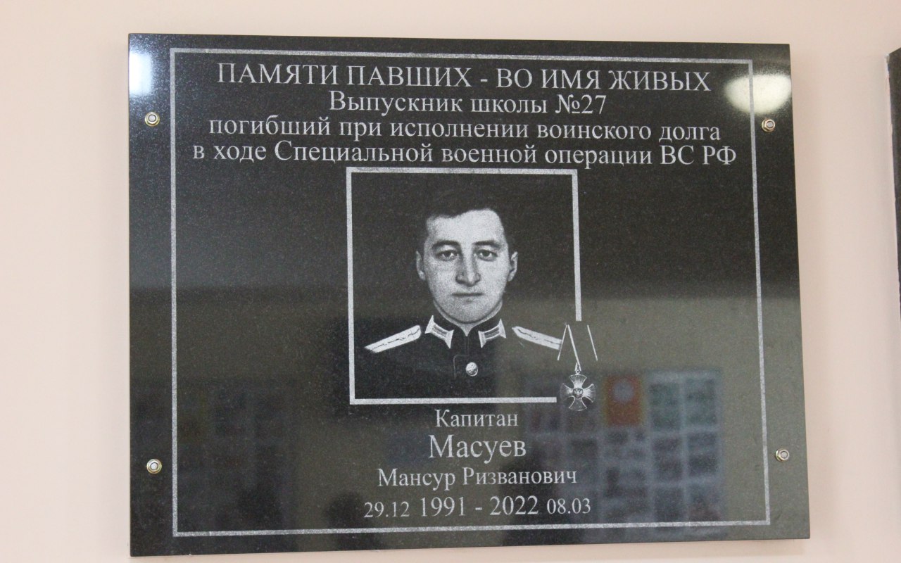 — Сегодня в нашей школе проходило значимое мероприятие — открытие мемориальной доски в честь нашего выпускника, капитана вооруженных сил России Мансура Масуева. Для нас большое значение имеют мероприятия патриотической направленности. Это событие печальное, но торжественное и значимое для школы, учеников и всего города. Оно важно для патриотического воспитания. Наши ученики будут всегда видеть и знать о героях нашей страны, о выпускниках своей школы. Сейчас важно приучить детей чтить память, уважать тех, кто защищает всех нас с вами. Так нынешнее поколение будет осознавать значимость жизни и мира, — рассказала директор средней школы №27 Инна Волчихина.