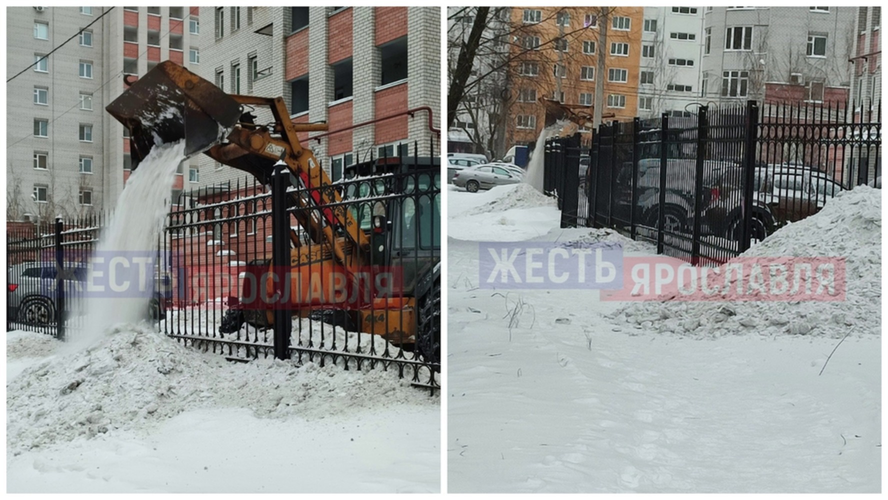 Речь идёт о дворе у дома №7 на улице Машиностроителей в Ярославле. На фотографиях, выложенных в ярославские паблики видно, как грейдер скидывает с ковша убранный снег. Делает он это аккурат за забор, где находится детский сад №101.