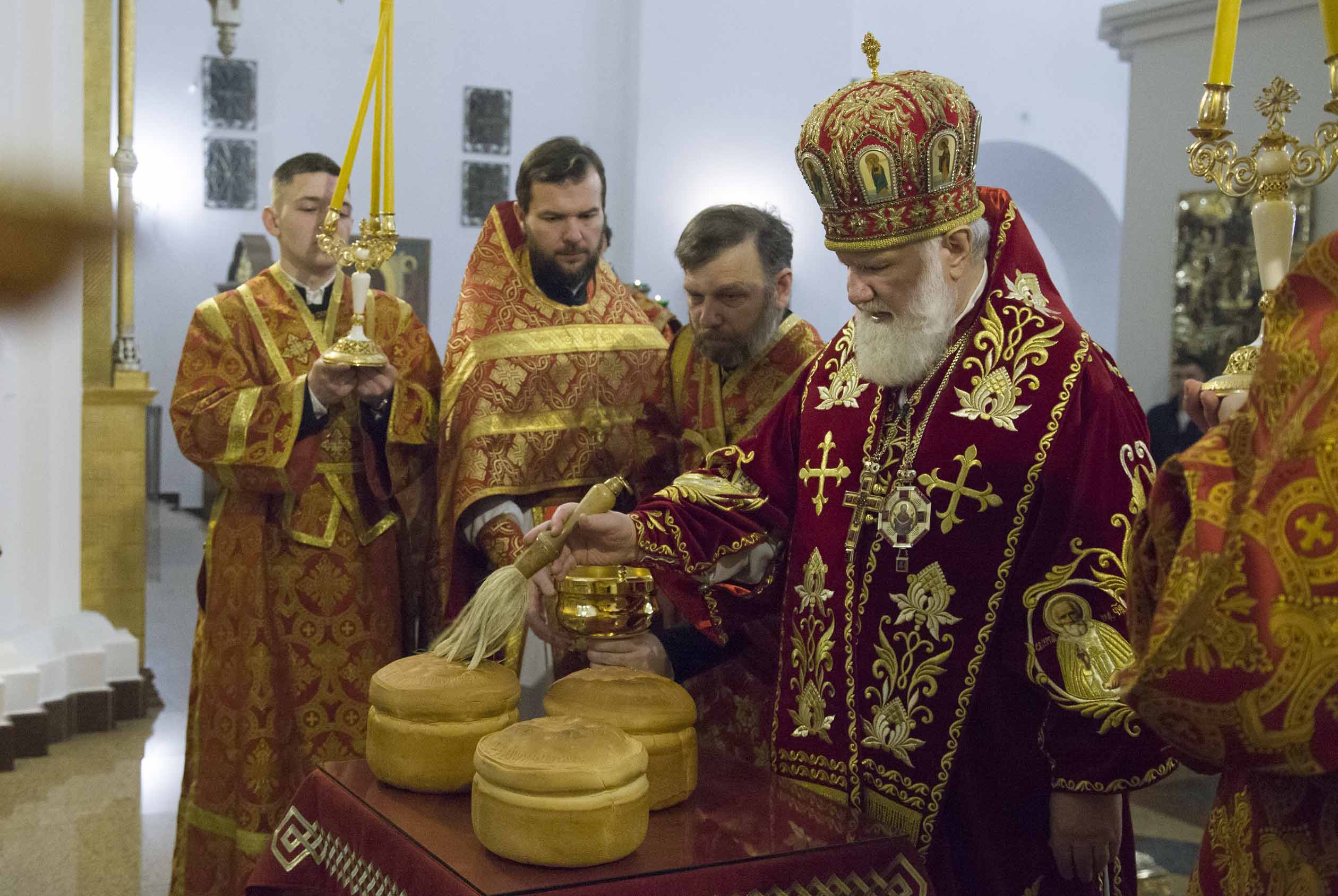 После запричастного стиха было прочитано Пасхальное послание Святейшего Патриарха Московского и всея Руси Кирилла. По заамвонной молитве владыка освятил артос – хлеб на закваске, который символизирует присутствие Иисуса Христа в нашей жизни. Традиция употреблять артос восходит к апостольскому времени.