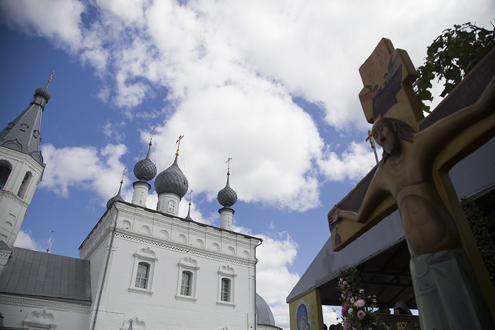 Сердечно приветствую всех участников нынешних торжеств. 600 лет назад, в болотистых местах Переславль-Залесской стороны, в районе села Годеново, чудесным образом был явлен крест Господень.