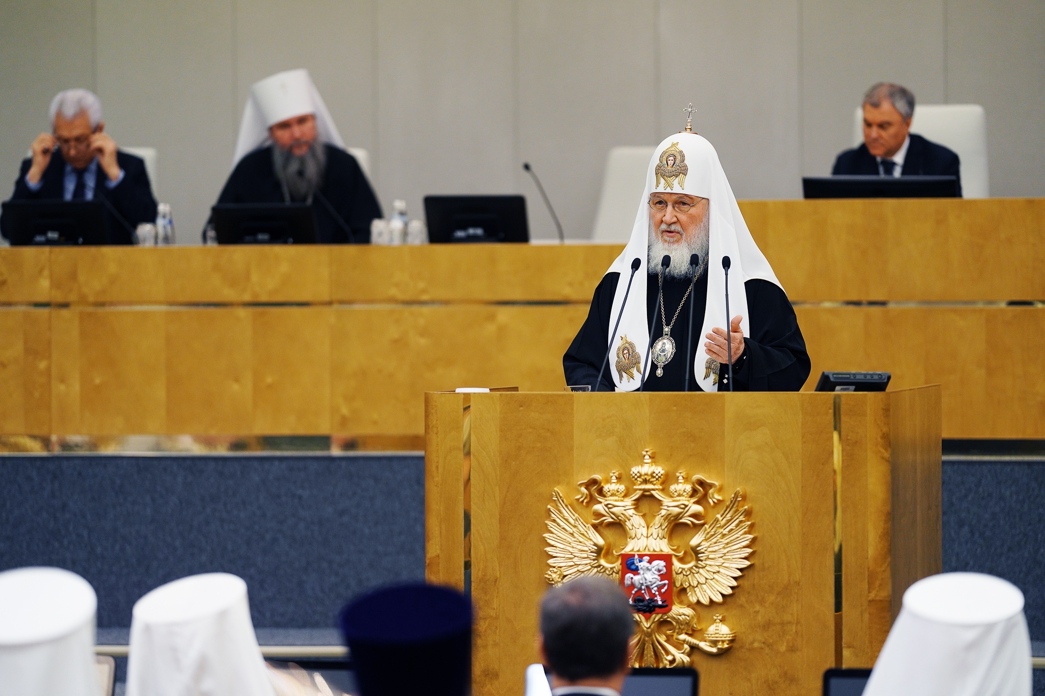 Святейший Патриарх Кирилл, В.В. Володин и митрополит Евгений прошли в зал заседаний Государственной Думы и заняли места в президиуме.