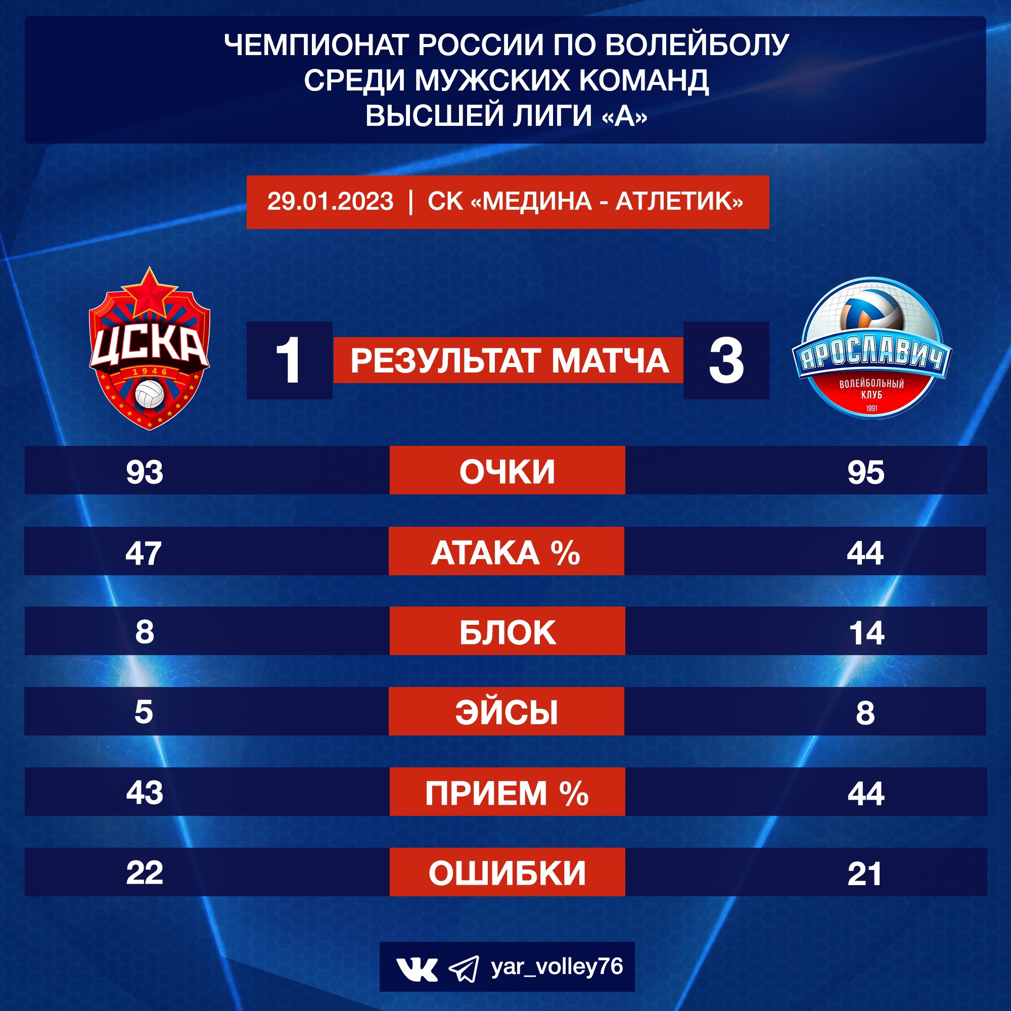 ЦСКА - «Ярославич» - 1:3 ( 20:25, 25:27, 25:18, 23:25 )