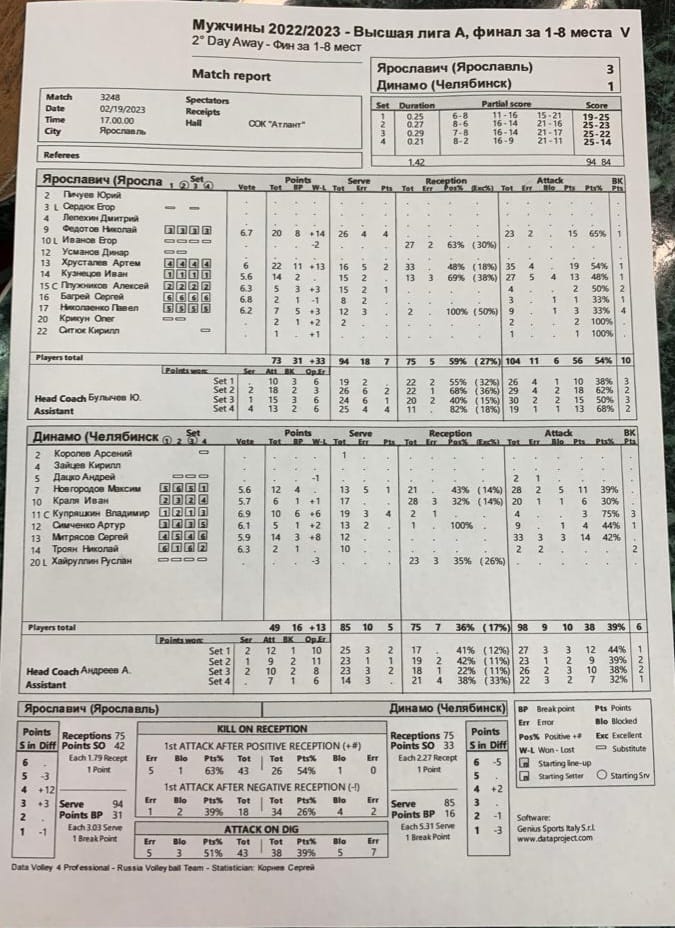 Самым результативным игроком в составе «Ярославича» стал доигровщик Артём Хрусталев, набравший 22 очка (19 результативных атак, 2 эйса и 1 блок). В сегодняшнем матче ярославцы доминировали в атаке (56 очков против 38 у «Динамо») и на блоке - 10 результативных действий против 6 у челябинцев.