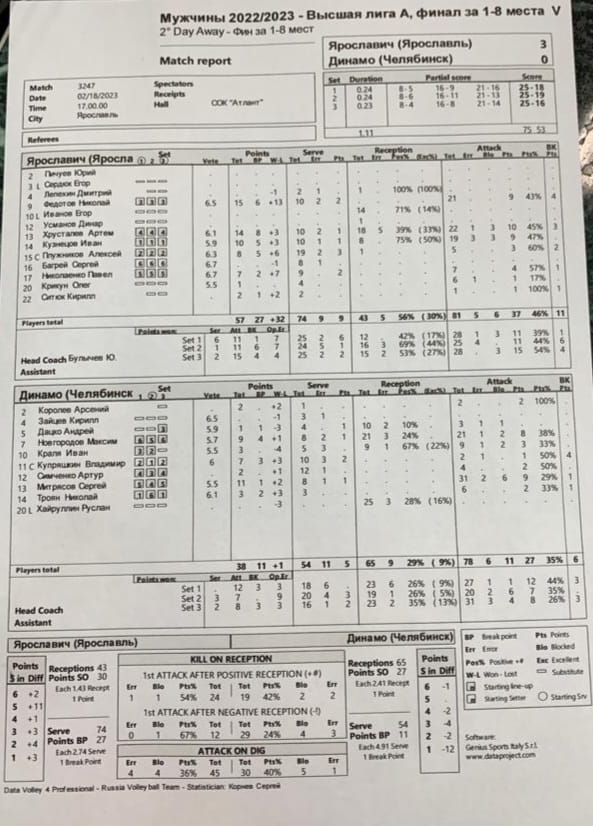Дебютант команды диагональный Николай Федотов стал самым результативным игроком в составе «Ярославича» с 15 очками. В сегодняшнем матче ярославцы превзошли челябинцев в атаке (37 очков против 27 у «Динамо»), доминировали на блоке (11 результативных действий против 6) и уверенно подавали - 9 эйсов против 5 у челябинцев.