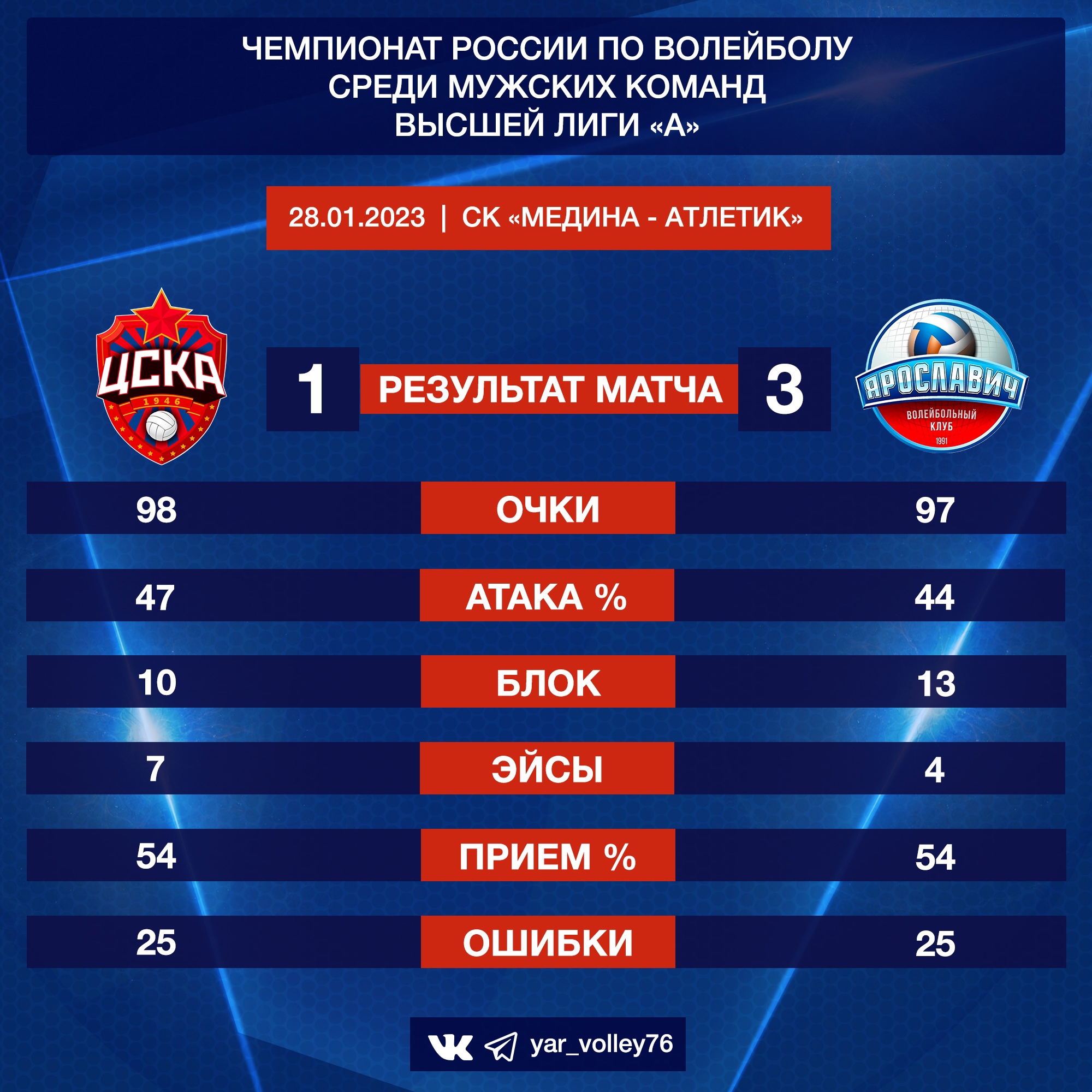 Самым результативным игроком в составе «Ярославича» стал доигровщик Иван Кузнецов, заработавший 22 очка. Блокирующий Алексей Плужников стал вторым по результативности в команде - 15 очков, в том числе на его счету 5 блоков и 82% эффективности в нападении (9 забитых мячей из 11 атак). Завтра соперники встретятся в заключительном поединке предварительного этапа чемпионата России Высшей лиги «А», начало матча в 17.00.ЦСКА - «Ярославич» - 1:3 ( 24:26, 25:18, 23:25, 26:28 )