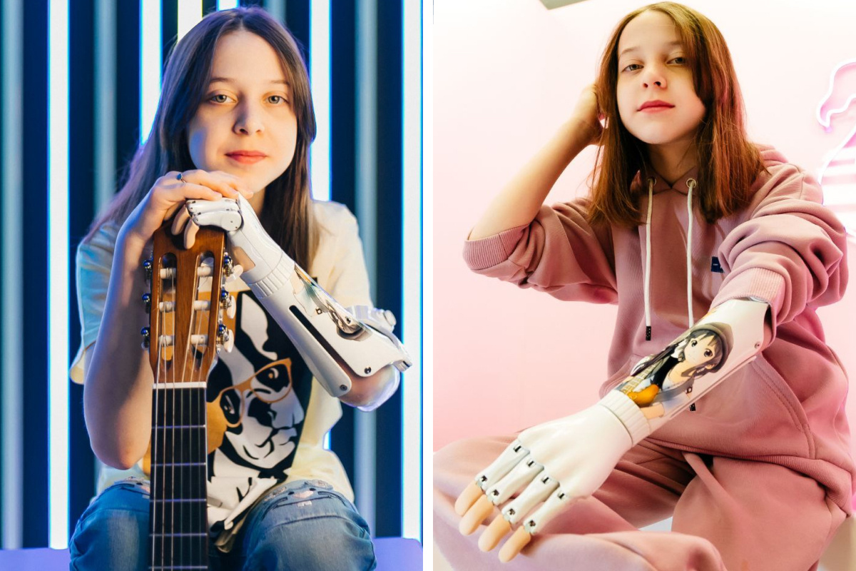 Ботинки на тракторной подошве, джинсы-клеш и черный свитер. Стильный образ 12-летней Полины Миллер из Омской области дополняют гитара через плечо и черный протез с изображением любимого корейского певца. Девочка родилась с аплазией левой руки: у нее не сформировались кисть и часть предплечья. Но это не мешает ей пробовать то, что нравится. Игрой на музыкальном инструменте шестиклассница увлеклась около года назад. А еще она занимается танцами, покоряет трассы в веревочном парке, катается на велосипеде и роликах, готовит мини-торты.