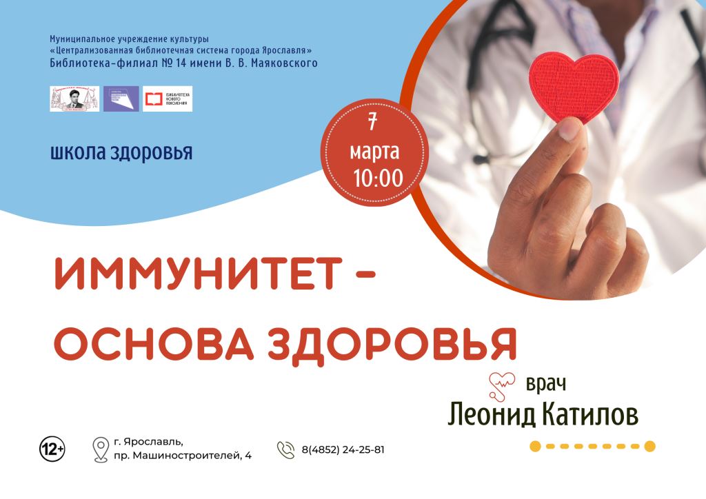 7 марта в 10:00 в библиотеке-филиале № 14 имени В.В. Маяковского состоится очередное занятие в школе здоровья по теме «Иммунитет – основа здоровья».