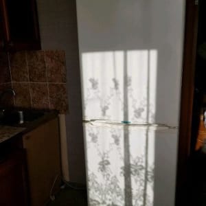 кухня - стол, стулья, гарнитур, большой холодильник.